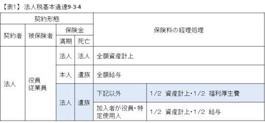 養老保険の保険料の経理処理は法人税基本通達9-3-4に書かれています。そして、普遍的加入によるハーフタックス養老保険は、保険料の1/2資産計上・1/2福利厚生費となる契約ですから、表中のブルーの部分です。