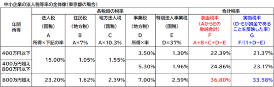 下表は、東京都における資本金1億円以下の普通法人の法人税等です。法人税等の実効税率である約33%は表中の青文字に、非上場株式の相続税評価額である純資産価額における37%控除は赤文字に由来します。