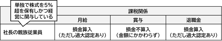 社長の親族従業員は一定の場合には従業員なのに(役員登記されていないのに)、役員とみなされます。そうすると社長と同じ課税関係になります。つまり上表のうち賞与が全額損金不算入に変わります。一定の場合とは「その親族が単独で株式を5%超えを所有しかつ経営に関与している場合」です。