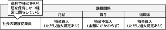 社長の親族従業員は一定の場合には従業員なのに(役員登記されていないのに)、役員とみなされます。そうすると社長と同じ課税関係になります。つまり上表のうち賞与が全額損金不算入に変わります。一定の場合とは「その親族が単独で株式を5%超えを所有しかつ経営に関与している場合」です。